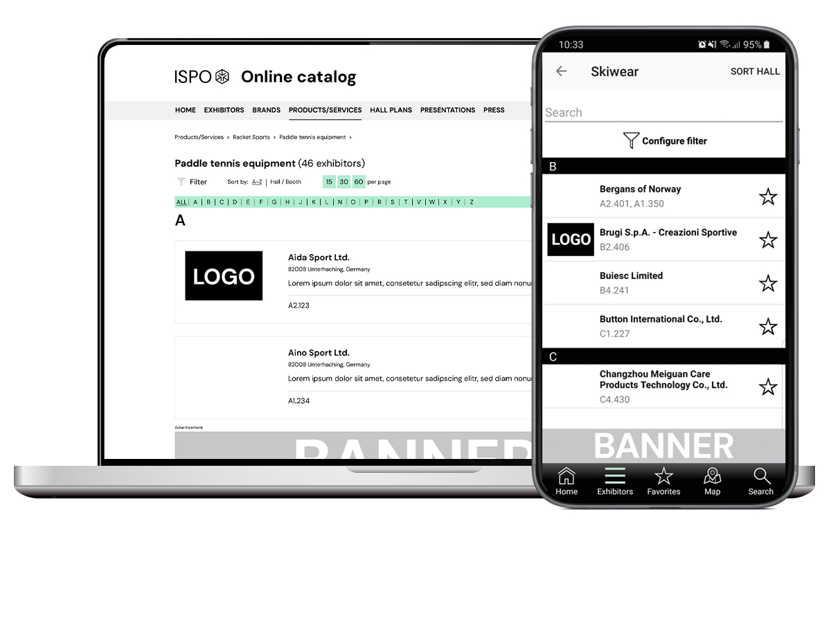 With this prominent logo placement, you will be found quickly and easily in the online catalog. Your logo will appear on several pages of the online catalog and link to your exhibitor profile. You can also advertise prominently with your logo in the app.